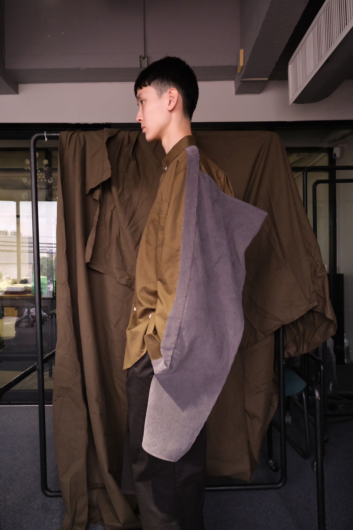 Green cotton shirt with grey corduroy details